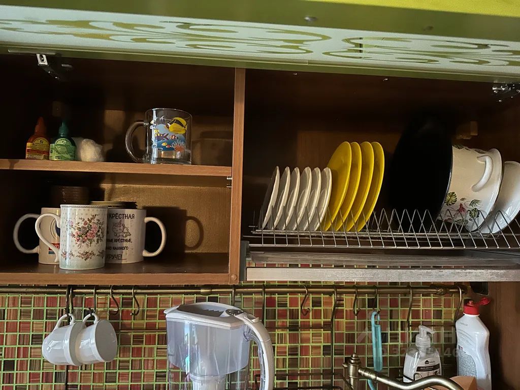 Кухня с посудой, микроволновка, чайник, мультиварка, вар. Панель газ, духовой шкаф газ, холодильник встроенный, телевизор, фильтр для воды, чай, кофе, сахар, соль.