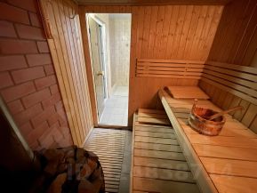 - 107,8 м² основной дом (указан в ЕГРН — планировка на фото). В доме второй свет, два входа, два санузла. Через терасу — вход в баню со своим санузлом.