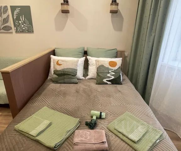 Уютная, чистая квартира со всей техникой и мебелью. В спальне большая двуспальная кровать ортопедический матрас. В кухне- гостинной раскладывающийся диван, телевизор, вместительная кухня, посудомойка, есть все, чтобы приготовить полноценный обед.