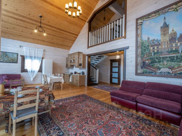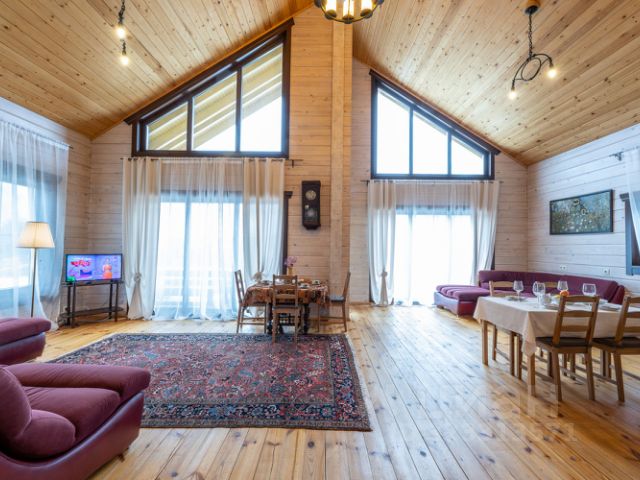 На первом этаже гостиная с кухней, санузел и маленькая баня. В гостиной располагается раскладной стол, раскладной диван, телевизор - смарт, музыкальный центр, кондиционер, дровяной камин, беспроводной интернет. Кухня наполнена всем необходимым, посуда для приготовления и сервировки, холодильник, варочная плита с духовкой, микроволновая печь, бутыль 20л с питьевой водой. На втором этаже размещаться изолированная спальня с двумя двуспальными кроватями, атак же двуспальная кровать в открытой лаундж-зоне.